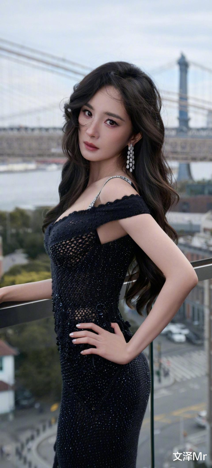 镜头拉近才发现黑裙暗藏玄机!上万颗手工缝制亮片在自然光下流转暗芒,单肩设计巧妙露出精致锁骨线。当她的指尖轻抚栏杆,身后高架桥车流如织,仿佛整个城市都成了她的背景板。把少女感与成熟气场完美融合,内娱独此一份!